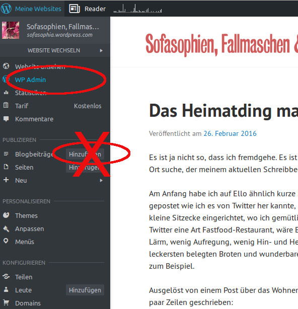 Doch will ich nicht über die neue, für seriöses Bloggen unbrauchbaren Methode − die ich zwar auf dem Handy und Tablet nutze, und dafür ist sie auch okay − meine Artikel posten, sondern will ich eben über die klassische Blogmethode bloggen, muss ich seit den Neuerungen zuerst einen Umweg über die WP-Admin-Benutzeroberfläche machen, will heissen (siehe Grafik 1) den WP-Admin anklicken., und dort – über das Dashboard – das Menü „Beitrag erstellen“ öffnen.